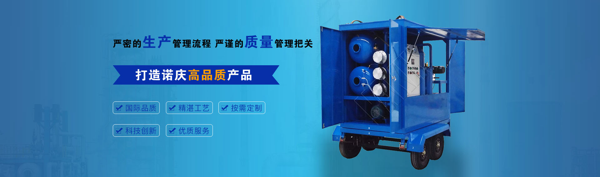 公司通過ISO9001-2015質(zhì)量管理體系認(rèn)證,CE歐盟認(rèn)證,諾慶公司所有濾油機(jī)配套產(chǎn)品均采用國內(nèi)外知名品牌,經(jīng)過多年的使用,具有質(zhì)量可靠,性能優(yōu)良。公司擁有完備的檢測儀器和檢測設(shè)備,所有產(chǎn)品出廠前經(jīng)過嚴(yán)格測試,保證每一臺產(chǎn)品合格出廠。生產(chǎn)實力雄厚